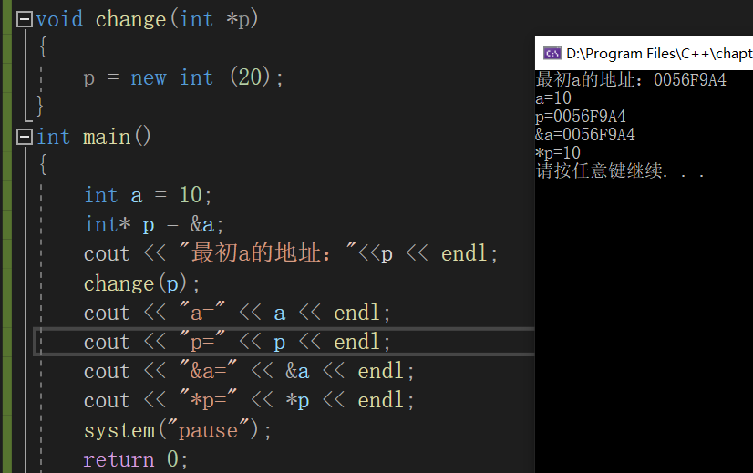 本代码中,即将p取个别名pp,对pp的修改就是对指针p的修改,既可以修改其p的地址也可修改其p指向的内容。其结果与上文一样。