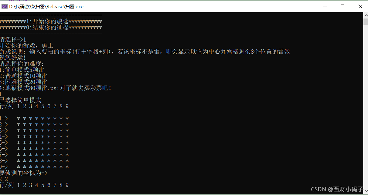 printf("游戏说明:输入要扫的坐标(行+空格+列),若该坐标不是雷,则会显示以它为中心九宫格剩余8个位置的雷数\n祝您好运!\n");
