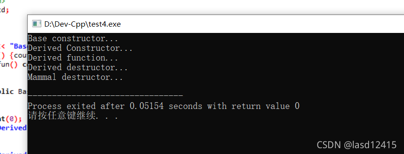 上面运行结果显示,派生类的析构函数没有调用,派生类的构造函数申请的空间泄露了,所以可将代码改成以下代码: