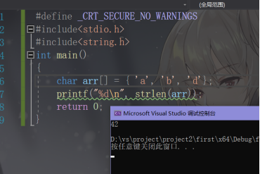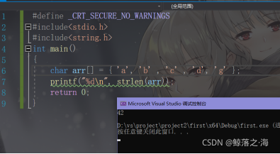 ? ? ? 在第一张图中,我们知道strlen遇到’\0’会自动停止,但字符串只开辟了5个连续的空间,strlen却读取了42个字符,说明它肯定顺着字符串地址连续向后访问了其他不归属与它的空间