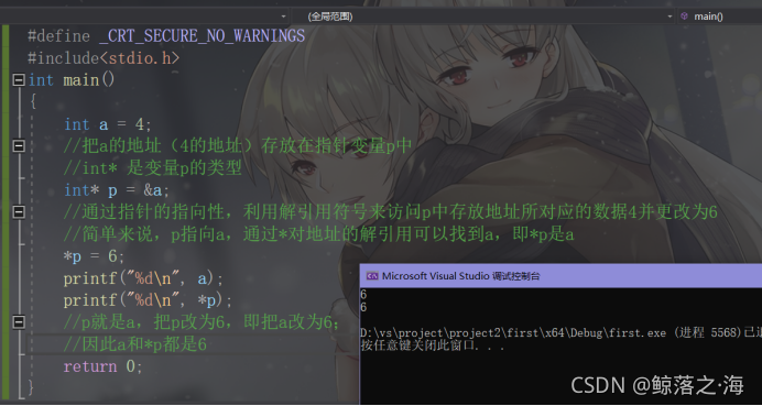 ? ? ?我们已经知道指针就是地址,而地址是一种数据,数据是可以被存储的,因此指针(或者说地址)是可以被存储的,用来存储地址(指针)的变量叫作指针变量,根据存放指针的类型(此时根据地址内存放数据的类型定义指针变量的类型即可,不必深究)定义指针变量类型即可,而指针具有指向性,指针变量里存储的地址指向该地址存放的数据,要想访问这个数据,我们就需要解引用(*)操作符,通过这个操作符,我们就可以找到这个数据?