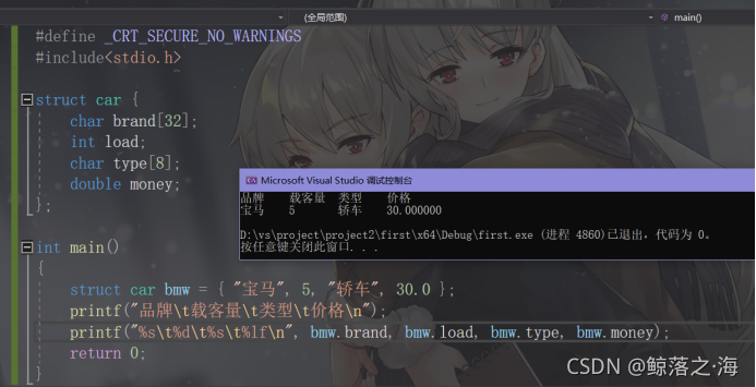 ? ? ? 自定义类型写在函数外,花括号最好要加分号。如图,定义了类型 struct car