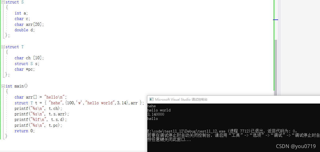 int main() { ?? ?char arr[] = "hello\n"; ?? ?struct T t = { "hehe",{100,'w',"hello world",3.14},arr }; ?? ?printf("%s\n", t.ch); ?? ?printf("%s\n", t.s.arr); ?? ?printf("%lf\n", t.s.d); ?? ?printf("%s\n", t.pc); ?? ?return 0; }