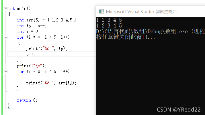 //int main() //{ //?? ?int arr[5] = { 1,2,3,4,5 }; //?? ?int *p = arr; //?? ?int i = 0; //?? ?for (i = 0; i < 5; i++) //?? ?{ //?? ??? ?printf("%d ", *p); //?? ??? ?p++; //?? ?} //?? ?printf("\n"); //?? ?for (i = 0; i < 5; i++) //?? ?{ //?? ??? ?printf("%d ", arr[i]); //?? ?} // //?? ?return 0; //}