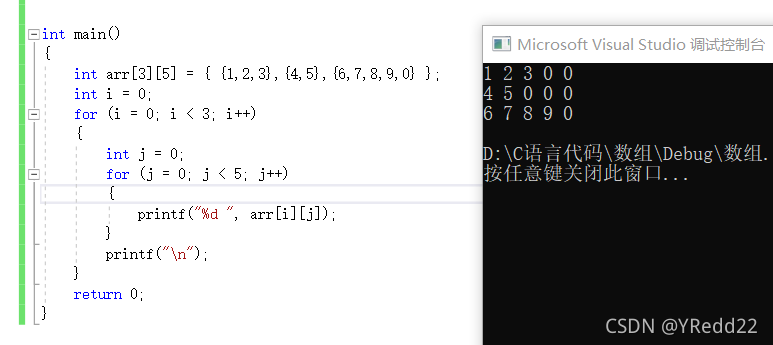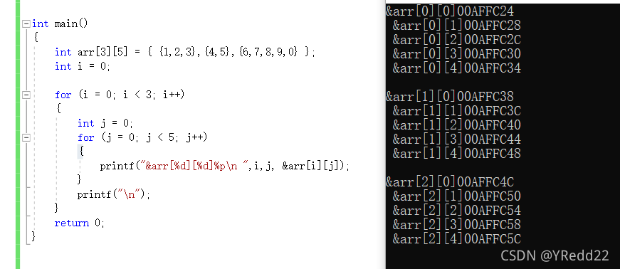 // //int main() //{ //?? ?int arr[3][5] = { {1,2,3},{4,5},{6,7,8,9,0} }; //?? ?int i = 0; // //?? ?for (i = 0; i < 3; i++) //?? ?{ //?? ??? ?int j = 0; //?? ??? ?for (j = 0; j < 5; j++) //?? ??? ?{ //?? ??? ??? ?printf("&arr[%d][%d]%p\n ",i,j, &arr[i][j]); //?? ??? ?} //?? ??? ?printf("\n"); //?? ?} //?? ?return 0; //}