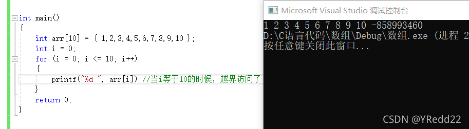 数组的下标是有范围限制的。 数组的下规定是从0开始的,如果输入有n个元素,最后一个元素的下标就是n-1。 所以数组的下标如果小于0,或者大于n-1,就是数组越界访问了,超出了数组合法空间的访问。 C语言本身是不做数组下标的越界检查,编译器也不一定报错,但是编译器不报错,并不意味着程序就是正确的,所以程序员写代码时,最好自己做越界的检查。