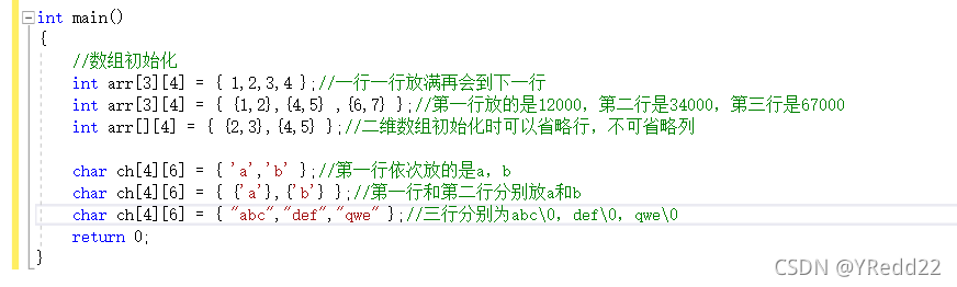 //int main() //{ //?? ?//数组初始化 //?? ?int arr[3][4] = { 1,2,3,4 };//一行一行放满再会到下一行 //?? ?int arr[3][4] = { {1,2},{4,5} ,{6,7} };//第一行放的是12000,第二行是34000,第三行是67000 //?? ?int arr[][4] = { {2,3},{4,5} };//二维数组初始化时可以省略行,不可省略列 // //?? ?char ch[4][6] = { 'a','b' };//第一行依次放的是a,b //?? ?char ch[4][6] = { {'a'},{'b'} };//第一行和第二行分别放a和b //?? ?char ch[4][6] = { "abc","def","qwe" };//三行分别为abc\0,def\0,qwe\0 //?? ?return 0; //}