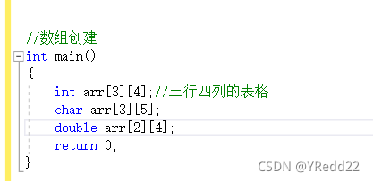 数组创建 //int main() //{ //?? ?int arr[3][4];//三行四列的表格 //?? ?char arr[3][5]; //?? ?double arr[2][4]; //?? ?return 0; //}
