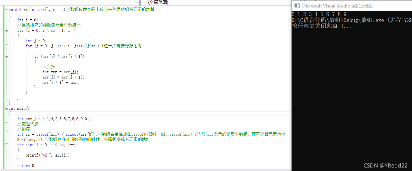 冒泡排序 //void Sort(int arr[],int sz)//数组传参实际上传过去的是数组首元素的地址 //{ //?? ?int i = 0; //?? ?//冒泡排序的趟数是元素个数减一 //?? ?for (i = 0; i < sz - 1; i++) //?? ?{ //?? ??? ?int j = 0; //?? ??? ?for (j = 0; j <sz-1-i; j++)//j<sz-1-i这一步需要好好思考 //?? ??? ?{ //?? ??? ??? ?if (arr[j] > arr[j + 1]) //?? ??? ??? ?{ //?? ??? ??? ??? ?//交换 //?? ??? ??? ??? ?int tmp = arr[j]; //?? ??? ??? ??? ?arr[j] = arr[j + 1]; //?? ??? ??? ??? ?arr[j + 1] = tmp; //?? ??? ??? ?} //?? ??? ?} //?? ?} //} //int main() //{ //?? ?int arr[] = { 1,4,2,3,8,7,5,6,9,0 }; //?? ?//数组传参 //?? ?//排序 //?? ?int sz = sizeof(arr) / sizeof(arr[0]);//数组名单独放在sizeof内部时,如:sizeof(arr),这里的arr表示的是整个数组,而不是首元素地址 //?? ?Sort(arr,sz);//数组名在传递给函数的时候,会降级变成首元素的地址 //?? ?for (int i = 0; i < sz; i++) //?? ?{ //?? ??? ?printf("%d ", arr[i]); //?? ?} //?? ?return 0; //}