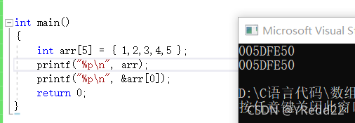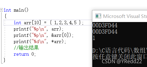 //int main() //{ //?? ?int arr[10] = { 1,2,3,4,5 }; //?? ?printf("%p\n", arr); //?? ?printf("%p\n", &arr[0]); //?? ?printf("%d\n", *arr); //?? ?//输出结果 //?? ?return 0; //}