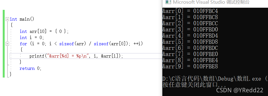 //int main() //{ //?? ?int arr[10] = { 0 }; //?? ?int i = 0; //?? ?for (i = 0; i < sizeof(arr) / sizeof(arr[0]); ++i) //?? ?{ //?? ??? ?printf("&arr[%d] = %p\n", i, &arr[i]); //?? ?} //?? ?return 0; //}