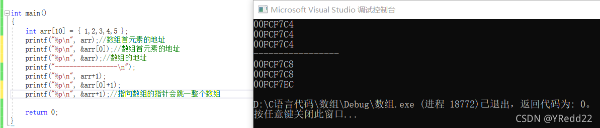 //int main() //{ //?? ?int arr[10] = { 1,2,3,4,5 }; //?? ?printf("%p\n", arr);//数组首元素的地址 //?? ?printf("%p\n", &arr[0]);//数组首元素的地址 //?? ?printf("%p\n", &arr);//数组的地址 //?? ?printf("-----------------\n"); //?? ?printf("%p\n", arr+1); //?? ?printf("%p\n", &arr[0]+1); //?? ?printf("%p\n", &arr+1);//指向数组的指针会跳一整个数组 // //?? ?return 0; //}