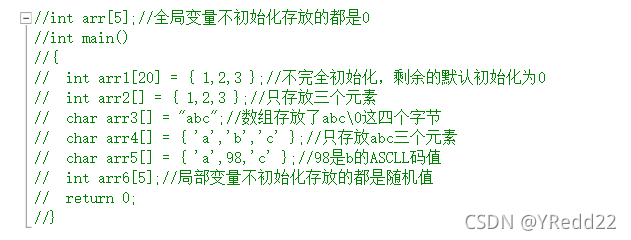 //int arr[5];//全局变量不初始化存放的都是0 //int main() //{ //?? ?int arr1[20] = { 1,2,3 };//不完全初始化,剩余的默认初始化为0 //?? ?int arr2[] = { 1,2,3 };//只存放三个元素 //?? ?char arr3[] = "abc";//数组存放了abc\0这四个字节 //?? ?char arr4[] = { 'a','b','c' };//只存放abc三个元素 //?? ?char arr5[] = { 'a',98,'c' };//98是b的ASCLL码值 //?? ?int arr6[5];//局部变量不初始化存放的都是随机值 //?? ?return 0; //}