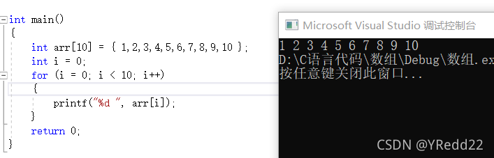 //int main() //{ //?? ?int arr[10] = { 1,2,3,4,5,6,7,8,9,10 }; //?? ?int i = 0; //?? ?for (i = 0; i < 10; i++) //?? ?{ //?? ??? ?printf("%d ", arr[i]); //?? ?} //?? ?return 0; //}