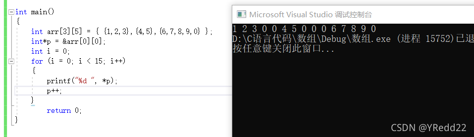 // //int main() //{ //?? ?int arr[3][5] = { {1,2,3},{4,5},{6,7,8,9,0} }; //?? ?int*p = &arr[0][0]; //?? ?int i = 0; //?? ?for (i = 0; i < 15; i++) //?? ?{ //?? ??? ?printf("%d ", *p); //?? ??? ?p++; //?? ?} //?? ??? ?return 0; //}