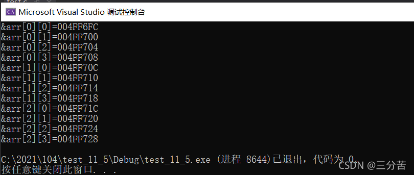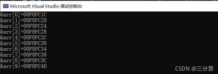 仔细观察输出的结果,我们知道,随着数组下标的增长,元素的地址,也在有规律的递增。 由此可以得出结论:数组在内存中是连续存放的。