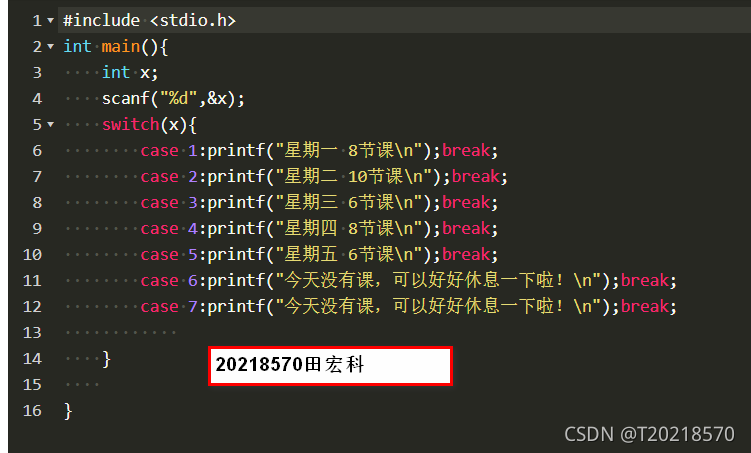 1.1: 读入一个整数1~7之间(不考虑输入错误的情况),然后输出需要上课的节数 1.1.1 贴图展示代码  1.1.2 数据处理 数据表达:运用int类型的变量,变量值由用户输入; 数据处理:运用switch循环。
