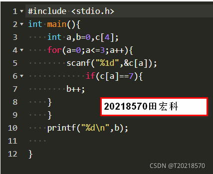 1.2 从键盘读入一个4位数的整数,求该数中有多少位是7 1.2.1 贴图展示代码  1.2.2 数据处理 数据表达:运用int类型,声明两个变量和一个数组,数组的值由用户输入; 数据处理:运用for循环和if判断类型。