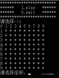 ? ? 与三子棋类似,扫雷游戏测载体也是一个x乘以y的矩形棋盘,我们同样可以使用二维数组进行搭建,但这次不同的是,我们需要建立两个二维数组,其中一个用来存放我们设置的地雷,另一个数组用来显示我们的扫雷过程。由于本次的棋盘比较大,我们在显示棋盘的时候添加了坐标轴的显示,这样除了能更加直观的观察棋盘外,也通过坐标轴将二维数组的第0行和第0列占用,这样我们在编写程序的时候就可以直接使用输入的值,而不用再进行换算。