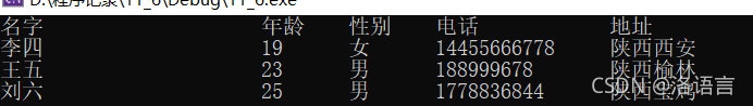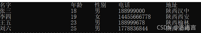printf("%-20s\t%4s\t%-5s\t%-12s\t%-20s\n", "名字", "年龄", "性别", "电话", "地址");