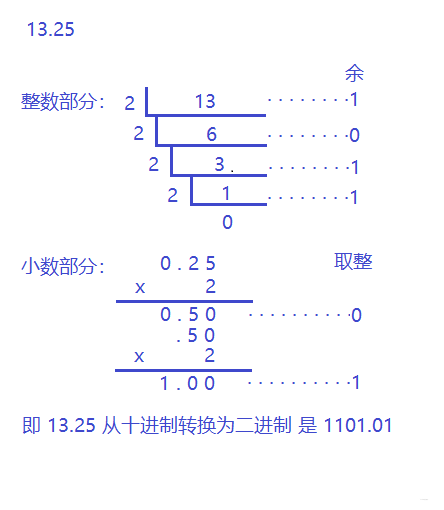 在学习浮点数在内存中的存储规则前,我们先来学习一下,浮点数怎么从十进制转换成二进制的表示形式。 举一个小小例子: 13.25 怎么从十进制转换成二进制呢? 很简单,对于整数部分,我们采用 除2求余法 · · · · · · ·对于小数部分,我们采用 乘2求整法