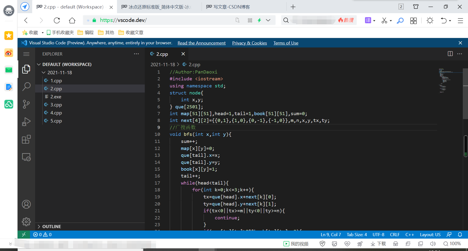 看到这道题时我手头这台电脑没有编辑器,听说微软出了一个vscode.dev ,在线编辑器,正好试试。但是我以前没有用过VSCode系列产品,试一试看吧,主要看代码就行: 测试数据: