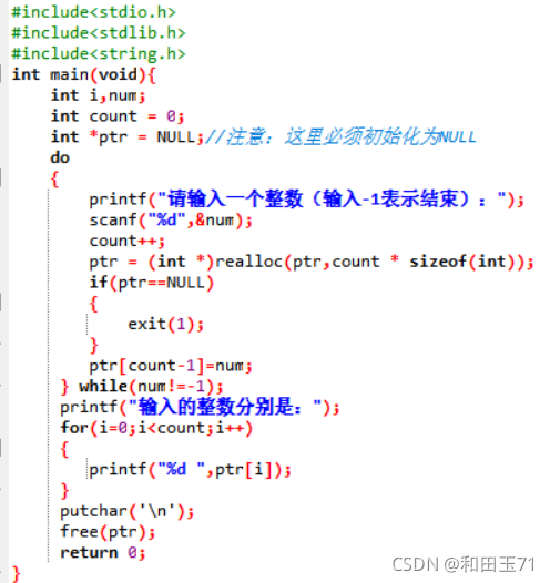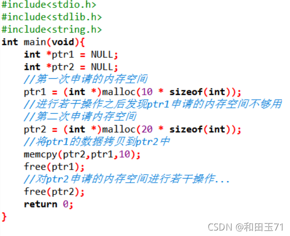 函数原型: void* realloc(void* ptr,size_t size); realloc函数修改ptr指向的内存空间大小为size字节 如果新分配的内存空间比原来的大,则旧内存块的数据不会发生改变;如果新的内存空 间大小小于旧的内存空间,可能会导致数据丢失。 该函数将移动内存空间的数据并返回新的指针 如果ptr参数为NULL,那么调用该函数就相当于调用malloc(size) 如果size参数为0,并且ptr参数不为NULL,那么调用该函数就相当于调用free(ptr) 除非ptr参数为NULL,否则ptr的值必须由先前调用malloc、calloc或realloc函数返回?