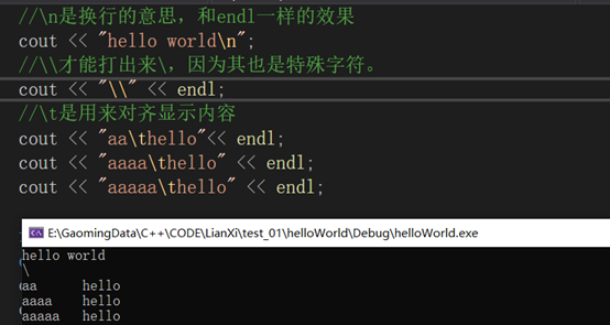 可以看到三种效果,特别是\t是加上前面的数据共有8位字节,可以达到对齐的效果。