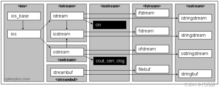 - C++系统实现了一个庞大的类库,其中ios为基类,其他类都是直接或间接派生自ios类;