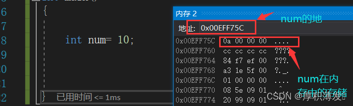 ?这里由于10转化为16进制(在内存中都是以16进制展示的)为0x00 00 00 0a,但是在内存中存储的是0a?00 00 00,显然在内存中是逆着存放的。