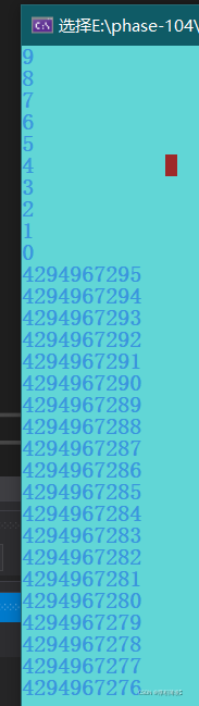 我们从9一直执行到0打印9-0,又因为呢,我们类型是unsignedint类型他就会把你给他的数全部变成正数又因为我们这个判断条件是大于等于0的所以条件恒成立,那至于后面的数怎么出来的呢?我们0判断之后接着就判断-1,-2(这些数被认为都是恒大于0的因为类型是unsignedint)那-1转化为无符号数就是图上的这些因此就变成了死循环。