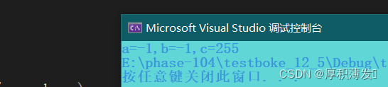 又因为这是原来的补码我们打印的是原码,所以我们要先变成反码11111111111111111111111111111110,原码为符号位不变其他位按位取反1000000000000000000000000001所以打印结果为-1,那b呢?刚才上面我们也说过在vs编译器中signed char《==》char,所以b的结果也为-1;这里的c就很特殊了因为是无符号数,无符号数要存负数的话,就要将负数转化为它对应的正数,那我们来分析一下,-1的补码为11111111111111111111111111111111存到char里进行截断,截断之后变成11111111,整形提升(因为是无符号数整形提升补0)变成00000000000000000000000011111111,打印我们要把它变成原码,因为它的符号位为0,所以是正数,所以它的补码就是原码就是为255.