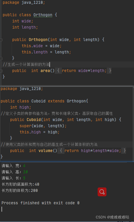 ?2.按要求编写一个Java应用程序: (1)定义一个类,描述一个矩形,包含有长、宽两种属性,和计算面积方法。 (2)编写一个类,继承自矩形类,同时该类描述长方体,具有长、宽、高属性,和计算体积的方法。 (3)编写一个测试类,对以上两个类进行测试,创建一个长方体,定义其长、宽、高,输出其底面积和体积。