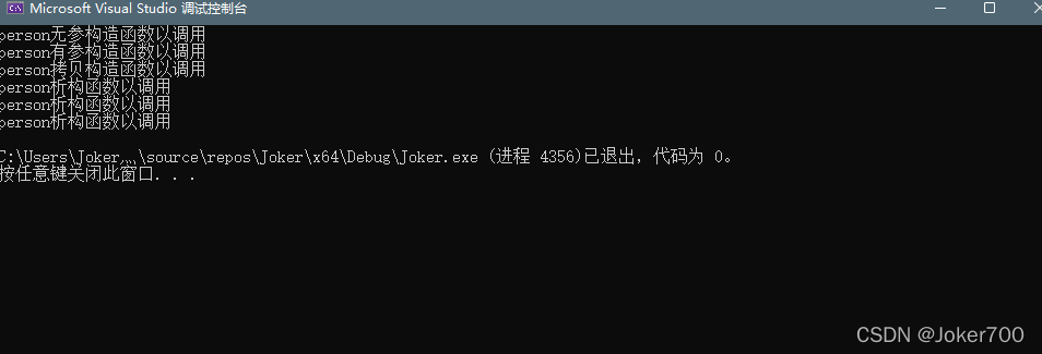 下面来说一说析构函数,何为析构函数,简单的说,用户以及编译器在声明构造函数时会给其分配一个内存空间,而在使用结束后,析构函数则负责释放这些空间,与构造函数同理,如果用户没有主观声明析构函数,编译器同样会调用一个默认的析构函数,每调用一次构造函数就会调用一次析构函数,代码示例如下: