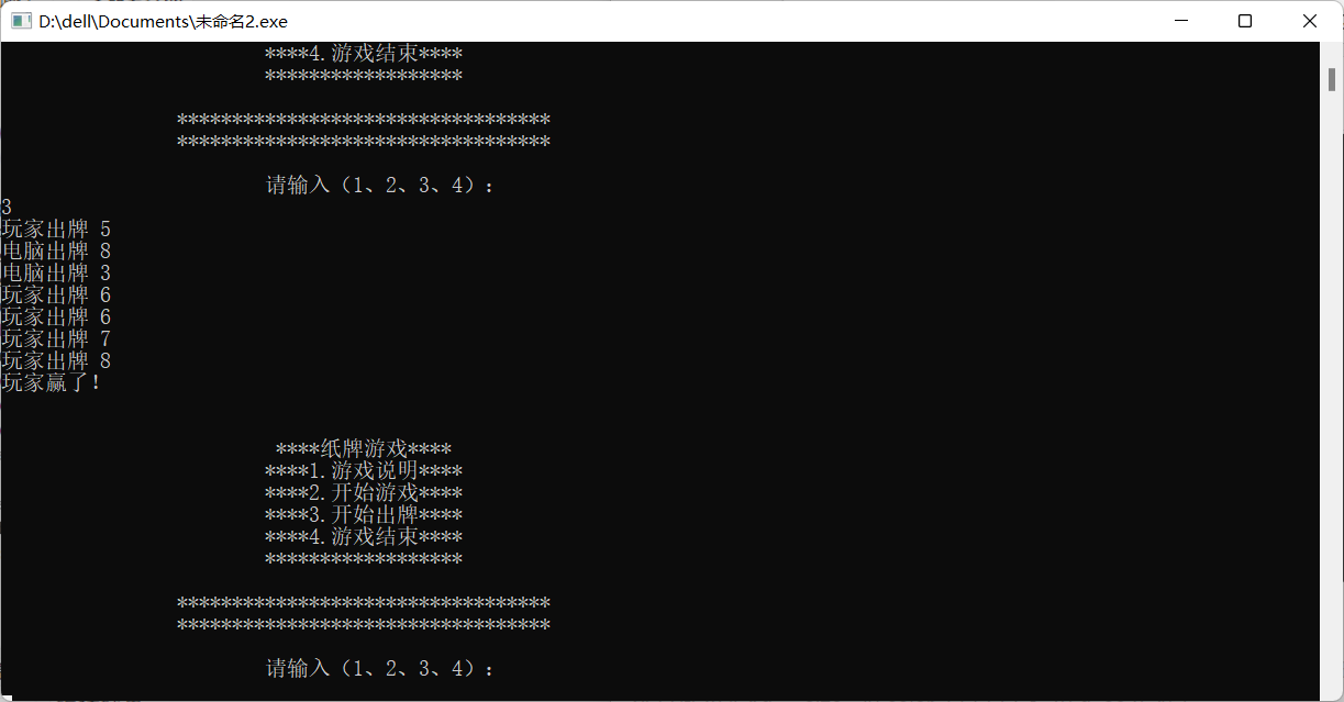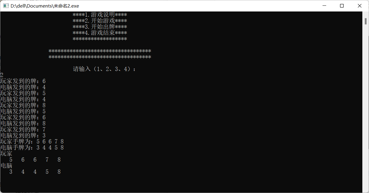 - 一副没有花牌(J、Q、K、A、大小王)的扑克牌,两个人进行纸牌游戏,其中一个人为用户,另一个人为计算机;