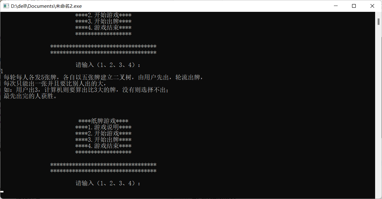 printf(" 每轮每人各发5张牌,各自以五张牌建立二叉树,由用户先出,轮流出牌,\n");