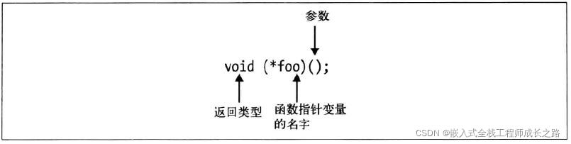 这个声明很像函数原型的声明,如果去掉第一对括号,看起来就像函数foo的原型,它接受void类型参数,返回void *类型值。括号让这个声明变成了一个名为foo的函数指针,*号表示这是一个指针。 如下图所示表示函数指针声明的各个部分:  下面是声明函数指针的其他一些例子: