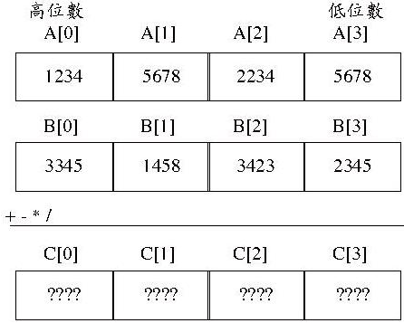 由于使用阵列来储存数值,关于数值在运算时的加减乘除等各种运算、位数的进位或借位就必须自行定义,加、减、乘都是由低位数开始运算,而除法则是由高位数开始运算,这边直接提供加减乘除运算的函式供作参考,以下的N为阵列长度。