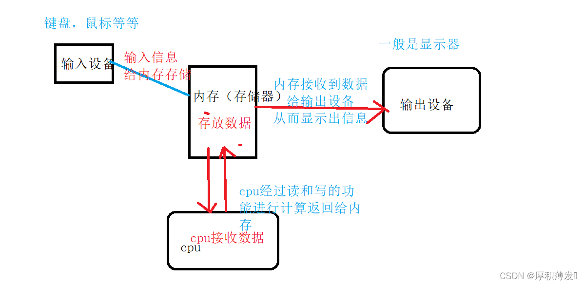 首先冯诺依曼体系有五个部件分别是存储器,运算器和控制器(这里统称cpu),输入设备,输出设备。