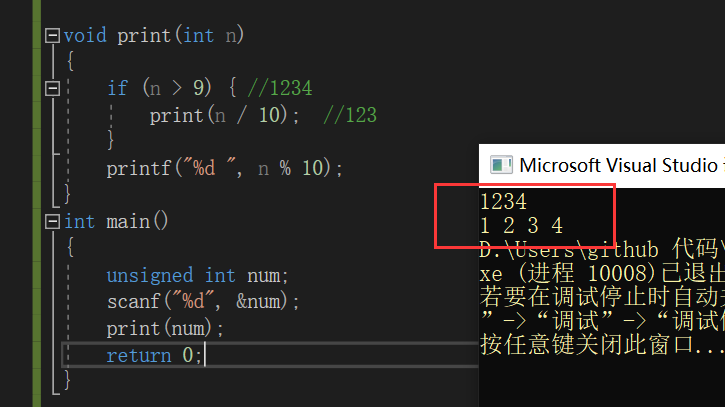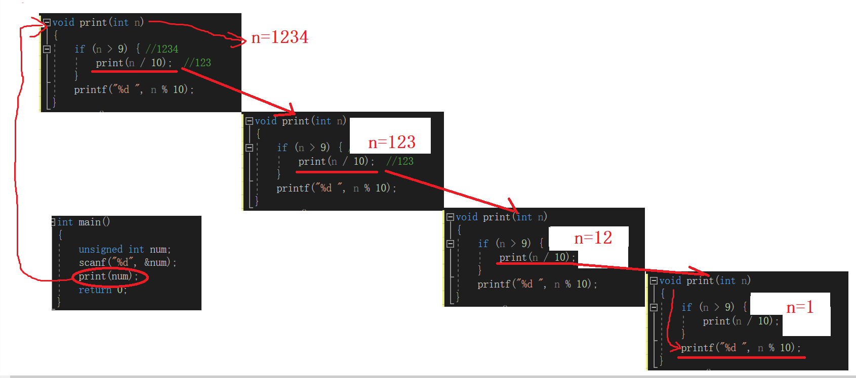 例一、接受一个整型值(无符号),按顺序打印它的每一位。例如:输入 1234,输出 1 2 3 4
