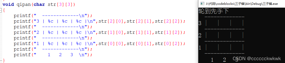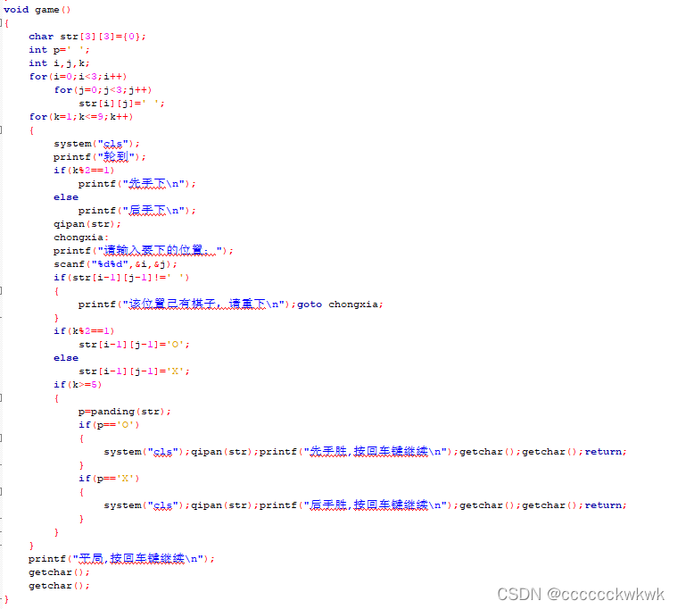 ? ? ? ? game()函数就开始对游戏过程的具体实施,其中qipan()函数进行对棋盘的打印,panding函数进行对胜负的判定,以及对现在轮到谁下进行提醒,因为三子棋最多只能走9步,所以在k=10(第10步)退出循环,如果在循环中为判定出胜负,则为平局,应为最快也要先手走3步,后手走两步才能分出胜负,所以可以在第5步及以后的每一步进行胜负的判定。?