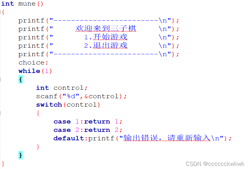 ????????mune()函数进行菜单的打印,以及接受玩家的选择并作出相应的处理,如果输入1||2以外的数字,就会陷入循环,知道输入1||2为止。