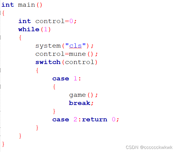 ????????首先,我们先写一个main()函数,用来控制这整个程序,你是否想玩利用mune()函数进行控制,而游戏的过程由game()函数负责实施。