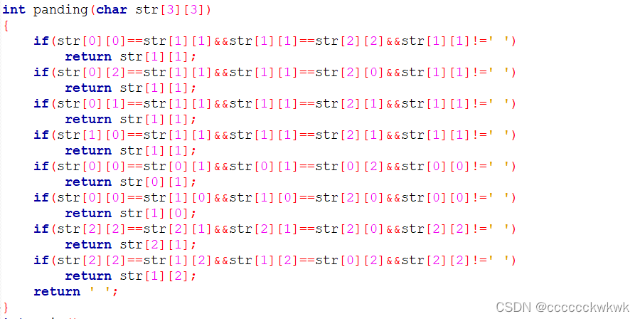????????三子棋的胜负就这8种情况,虽然str数组开始被我全部赋值为' '(空格),但是这里绝对要对该三连珠进行判定,保证其不为空格,如果没有这个判定,则在实际游戏过程中,当你实际连成的三连珠的判定在一个空的三连珠的判定后面时,程序无法判定胜负。