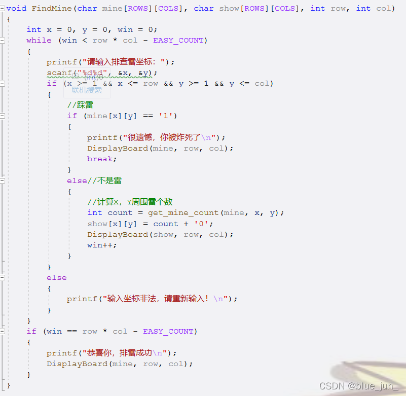 void FindMine(char mine[ROWS][COLS], char show[ROWS][COLS], int row, int col)