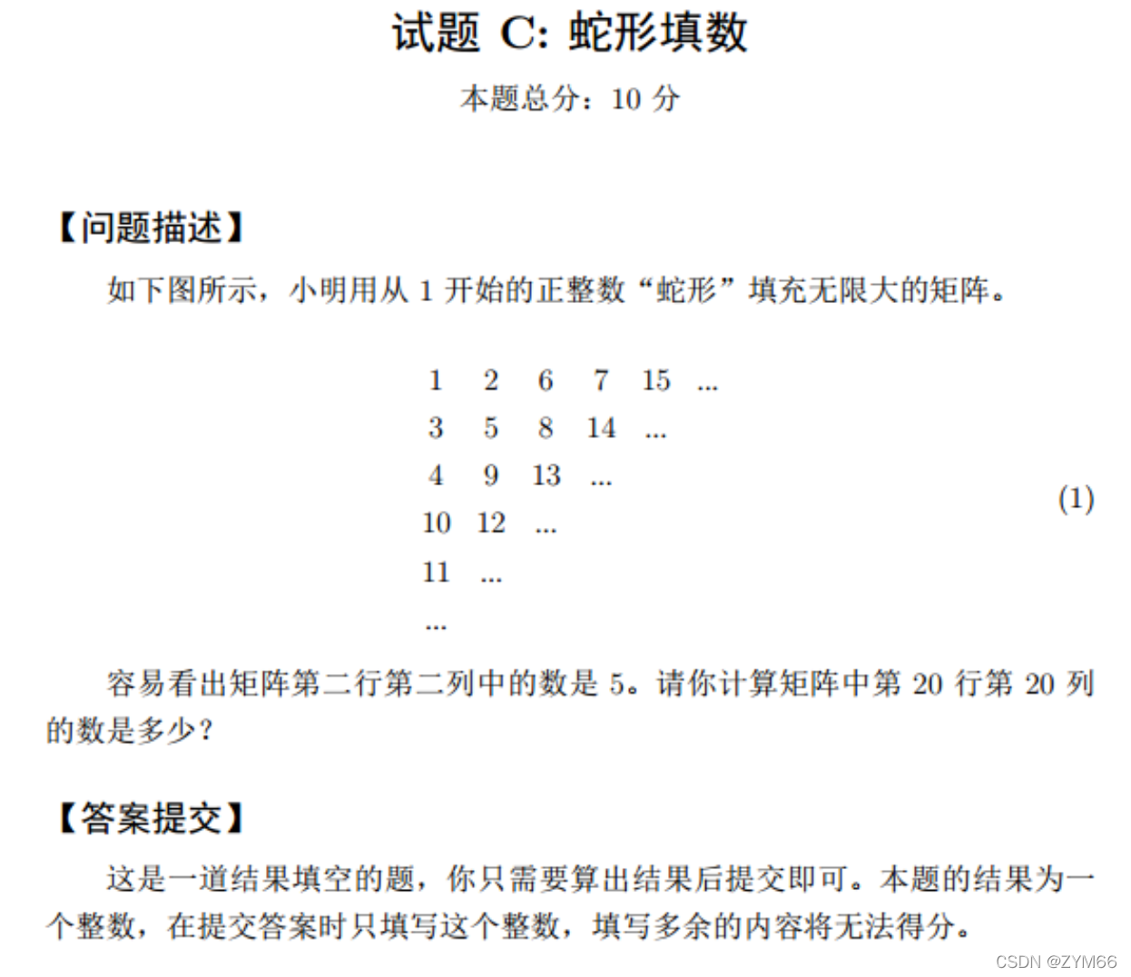 ?题解:我们不难看出1行1列数在1这个数组中,第2行第2列的数在第456数组中的中间位置,第三行第三列在11,12,13,14,15这个数组中的中间位置。我们按条斜线为一个数组,不难看出第n行n列就在等差数列数组1,3,5,7~~~中,即为第39个数组,我们先生成一个类似于[[1],[2,3],[4,5,6],[7,8,9,10]~~~]这样的形式代表一条斜线上的数字,第39条斜线数组即为位置为38位置的数组(从0开始算),这个数组内元素个数一定为奇数为29,那中间的位置为第15号(即为14号位置的元素),后边比较坑。
