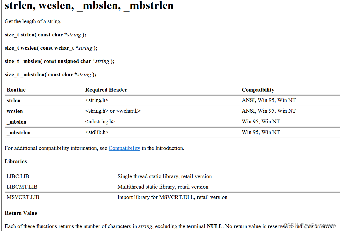 在这里我们重点看一下Return Value的内容,翻译过来就是:其中每个函数都返回字符串中的字符数,不包括终端 NULL。大致的意思就是strlen函数在运行时每碰到一个字符就加一,当碰到NULL也就是'\0'时会返回前面所有加一的和。