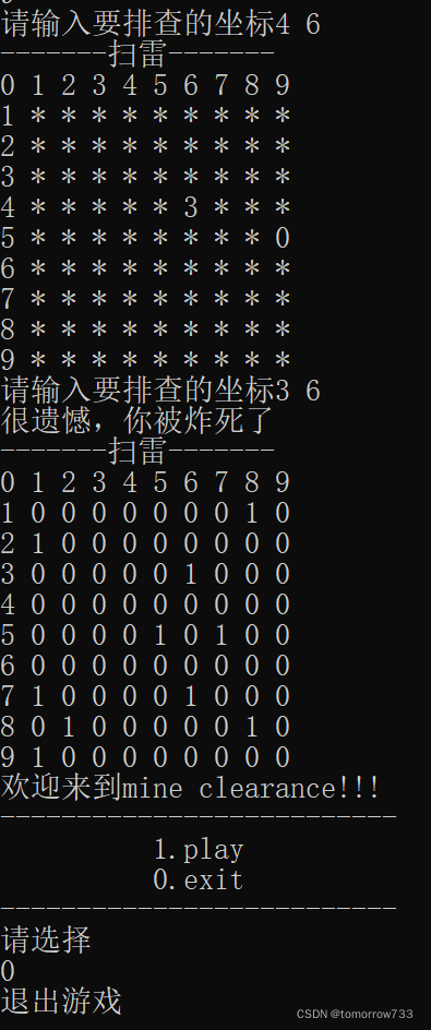 接下来用不同的字符来分别表示信息。用char mine =[9][9]设置雷,用char show=[11][11]数组来显示信息