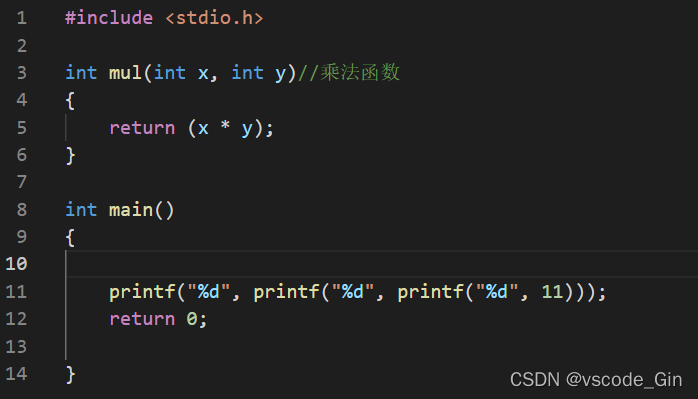 在上述代码中,我们将mul函数的返回值,作为了printf函数的参数打印。
