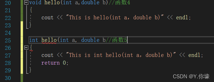 这里我们可以试一下函数返回值不同,按照二义性,如果2个函数的函数名相同,参数一致,只是返回值不同的话,那么就会出现二义性,导致编译器出错,如下图所示,函数4和函数5。